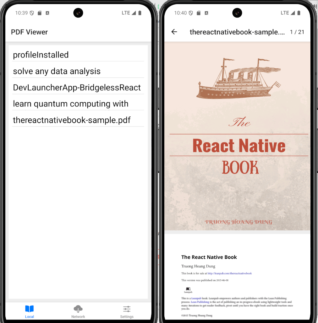 이렇게 Tab Navigator를 만들면, 어느 Stack Navigator 화면으로 연결할지를 선택하고 Stack의 Screen 컴포넌트에 등록해 주면 그 경로를 선택하면 아래 아이콘이 있는 Tab이 나타나게 된다. PDF Viewer 앱에서는 앞에서 FileListPage를 Local, Network, Setting의 세 개 Tab으로 나누고 Stack Navigator에 등록했다. 이제 실행해 보면 처음 앱이 시작하면 3개의 Tab이 있는 화면이 나타나고, 파일을 선택해서 ViewerPage로 바뀌면 Tab이 나타나지 않는다.
