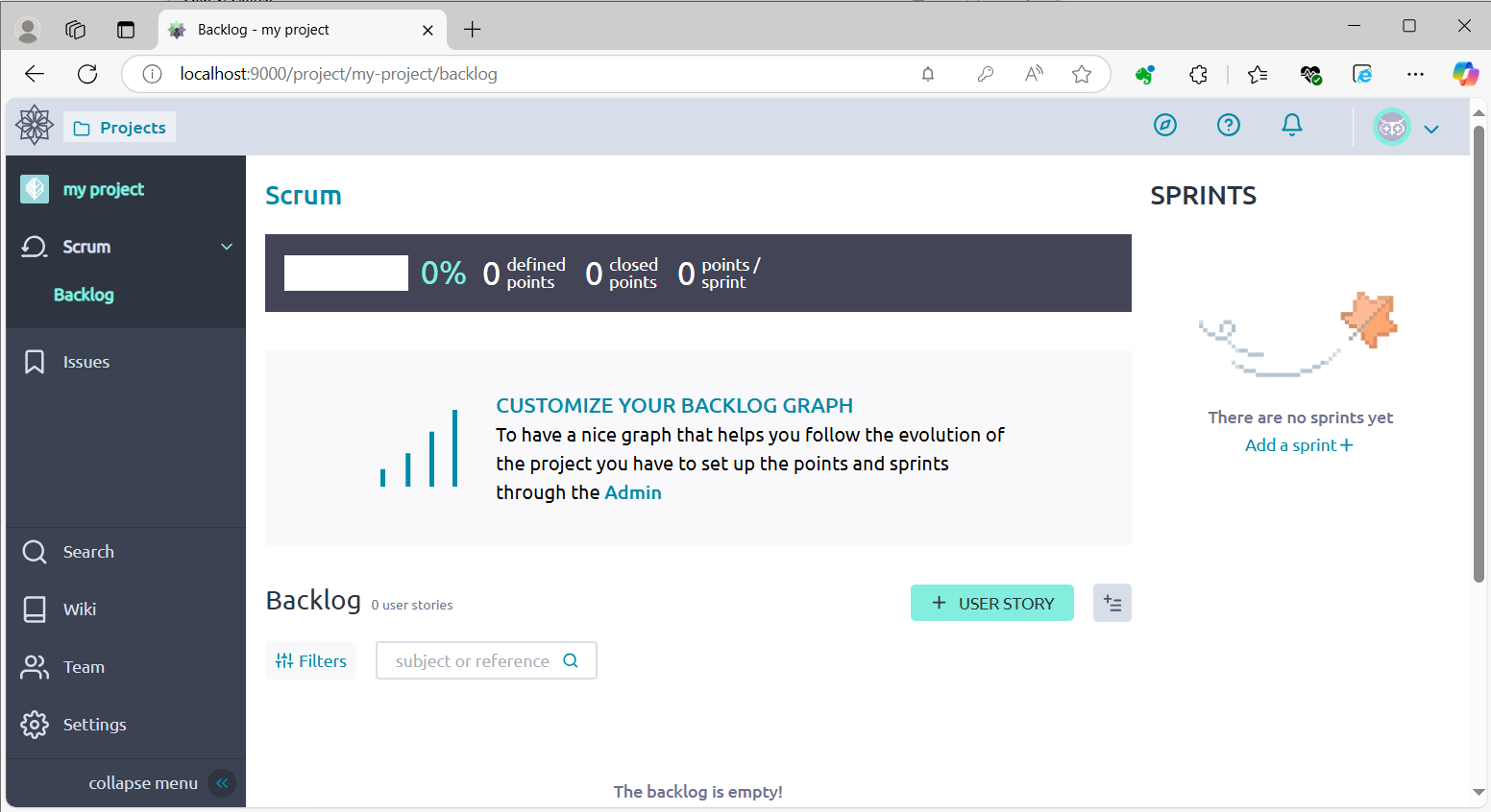 SCRUM을 선택하고 프로젝트에 대해 간략하게 입력해서 생성하면 아래돠 같은 초기 화면이 나타난다.