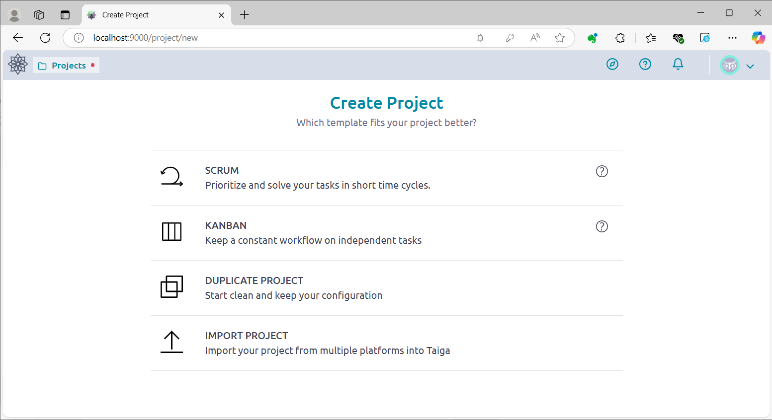 오른쪽에 "NEW PROJECT"버튼을 누르면 아래와 같이 SCRUM과 KABAN 프로젝트를 만들 수 있는 화면이 나타난다.
