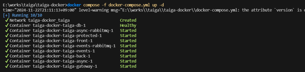 - taiga-docker폴더로 들어가서 docker compose를 실행한다.