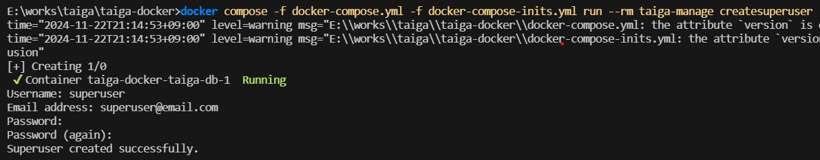 docker compose -f docker-compose.yml -f docker-compose-inits.yml run --rm taiga-manage createsuperuser