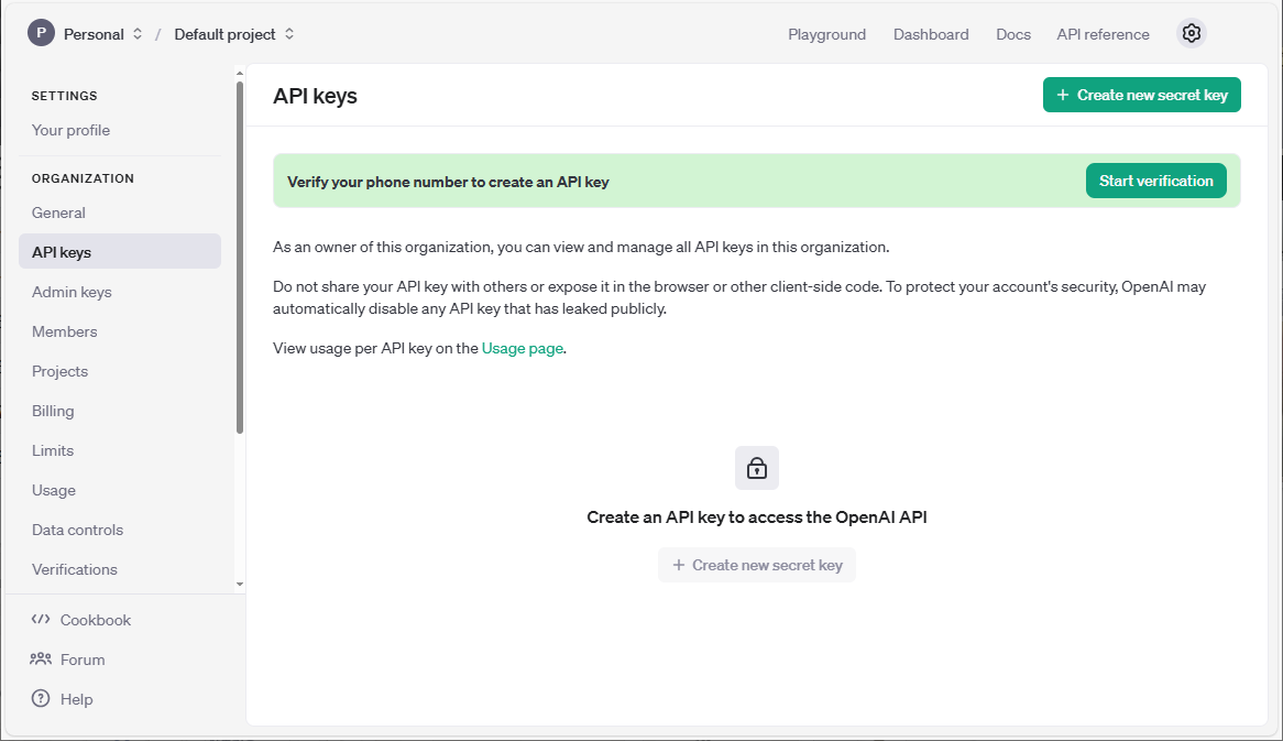 Python이나 다른 언어를 사용해서 Open AI를 사용하려면 API 키가 필요하다. API 카는 오른쪽 계정옆에 있는 Settings 아이콘을 누르면 나오는 화면에서 얻을 수 있다.