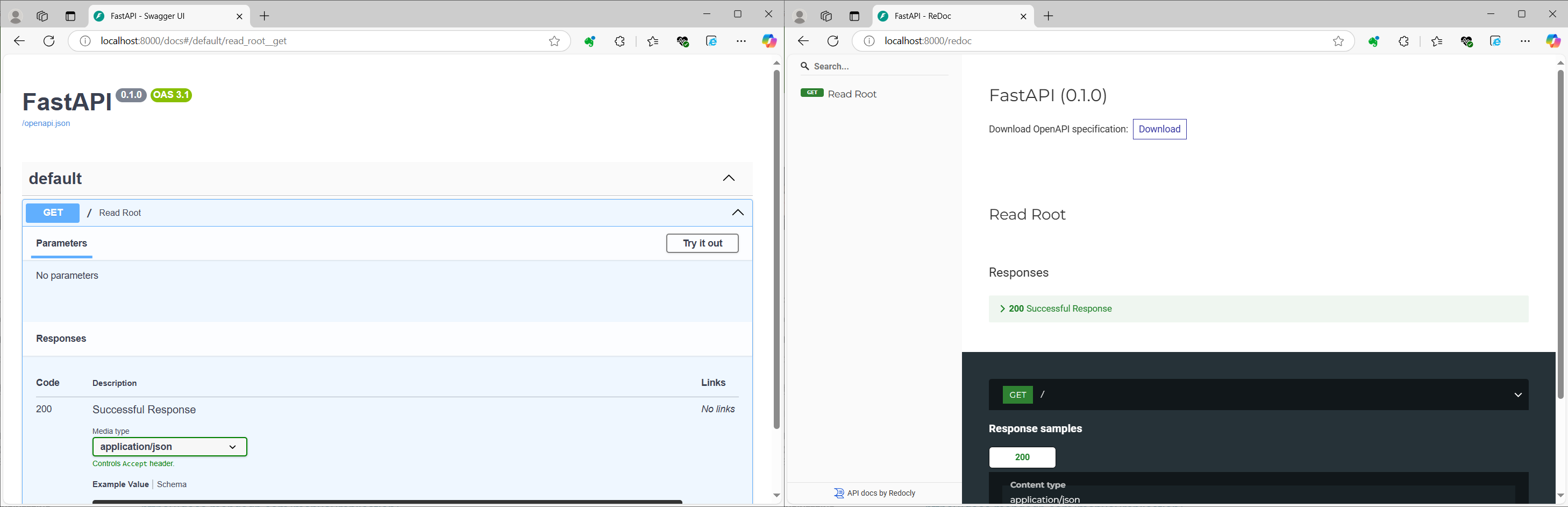 FastAPI는 이름에서 의미하듯이 API개발을 위한 프레임워크이기 때문에 별도의 패키지 설치 없이 Swagger가 지원된다. 친숙한 Swagger화면을 보려면 http://127.0.0.1:8000/docs 를 열면 Swagger화면이 나오는데, FastAPI는 추가로 http://127.0.0.1:8000/redoc 화면도 제공하고 있다. 또, 크라칸과 가은 API서버에 바로 사용할 수 있는 json으로 된 API정의서도 http://127.0.0.1:8000/openapi.json 을 통해 얻을 수 있다.