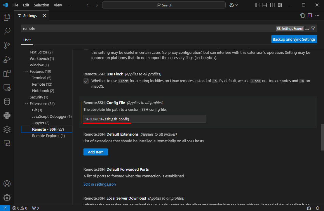 VSCode를 열고 톱니바퀴 아이콘을 눌러 설정화면을 연다. Ctrl + , 핫키를 사용해서 창을 열어도 된다. 아래와 같이 remote를 필터를 걸고 Remote - SSH를 선택한 후 오른쪽 화면의 아래에 찾아보면 Remote.SSH: Config file을 설정하는 항목이 있는데 여기에 앞에서 생성한 ssh_config파일의 위치를 넣는다. %HOME%은 인식되지 않으니 홈 디텍토리 아래에 있다면 전체 경로를 지정해야 한다.