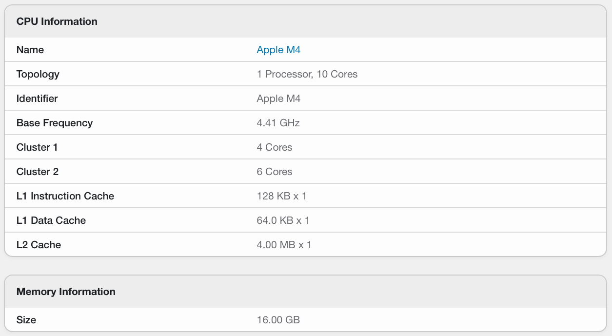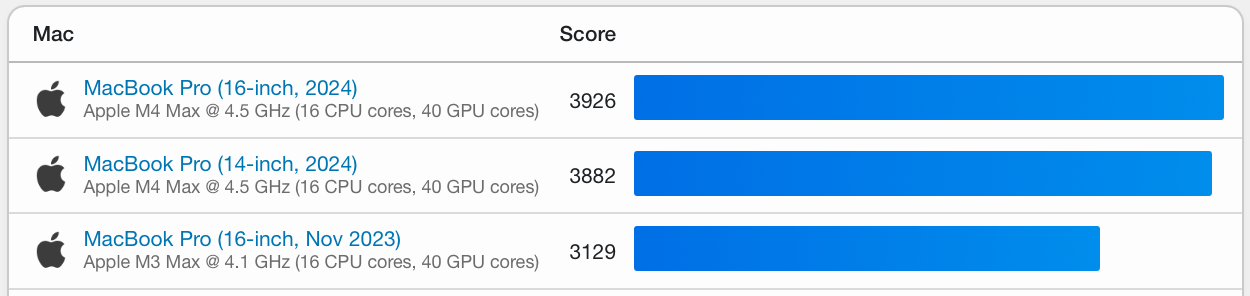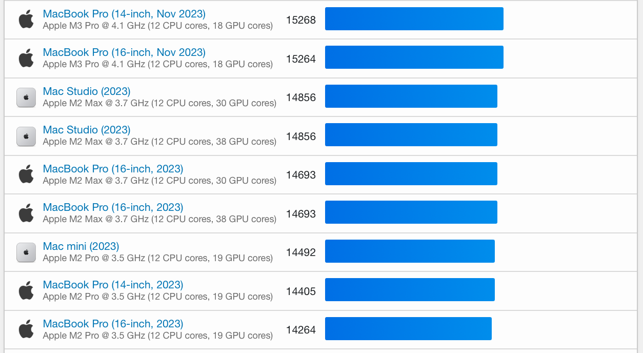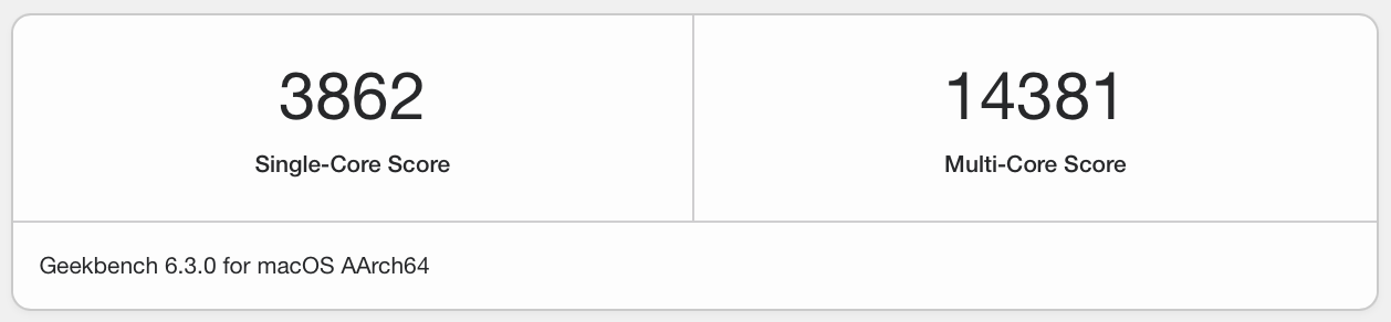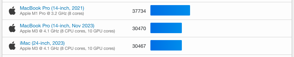 다른 기종의 Geekbench테스트 결과와 비교하면 Single-Core는 M3보다 확실히 높고, Multi-Core도 M3 12 CPU cores에 근접하는 성능을 보여주고 있다.