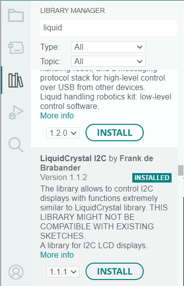 먼저, I2C 방식의 LCD를 연결하기 위해 먼저 아두이노 IDE의 Library Manager에서 해당 라이브러리를 찾아 설치한다.