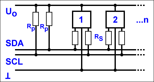 I2C는 Inter-Integrated Circuit의 약자로, 아두이노가 컴퓨터와 통신하기 위해 UART를 사용해서 RX, TX두선을 USB로 변환해서 주고받는 것처럼 IC(집적회로)끼리 통신할 때 2선으로 통신할 수 있도록 해 준다. 뿐만 아니라 아래의 그림처럼 1부터 n개로 구성된 여러 개의 IC를 SDA (Serial DAta), SCL (Serial CLock) 두 선으로 묶어도 모두와 통신이 가능하게 해 주는 편리한 프로토콜이다. 아두이노처럼 점퍼선을 사용해서 복잡한 기기들을 연결한다면 LCD의 예처럼 연결선을 2선 + 전원선으로 대폭 줄여줄 수 있다.