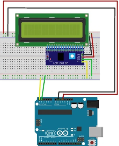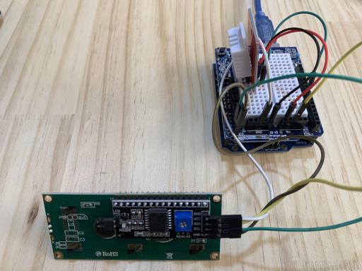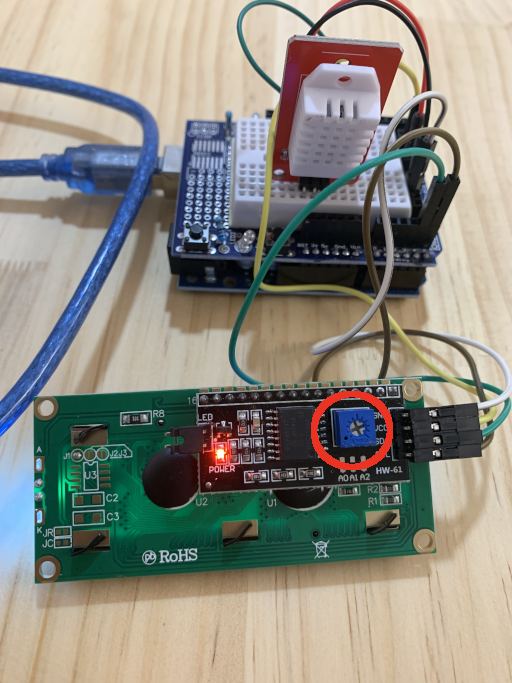 만일 LCD에 백라이트가 들어오고 SDA (A4 핀)와 SCL(A5 핀)을 제대로 연결했는데도 글자가 나오지 않는다면 뒷면에 있는 가변저항을 좌우로 돌려보자. 많은 경우 가변저항을 돌려보면 해결이 된다.