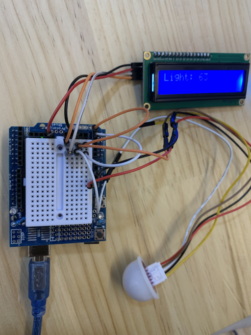 브레드 보드를 이용해서 SCL끼리 연결하고, SDA끼리 연결하도록 구성하고 나머지는 전원선만 연결하면 조도계가 완성된다.