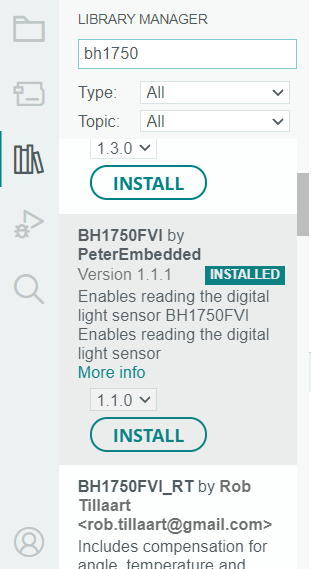 먼저, 광센서 BH1750FVI를 연결하기 위한 라이브러리를 아두이노 IDE의 Library Manager에서 찾아 설치한다.
