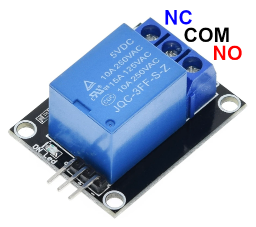 의 3개의 연결 단자가 있다. 이 스위치는 한 선만을 통제하기 때문에 전원의 한 선은 그냥 연결한다. 펌프라면 펌프에 한 선을 연결한다. 나머지 전원의 한 선을 COM에 연결하고 펌프와 NC에서 선을 연결하면 릴레이가 동작하지 않은 상태, 즉 전기가 없는 상태에서 연결되어 있다가 전기가 들어오면, 다시 말해 아두이노의 디지털 핀의 상태가 HIGH로 바뀌면 연결이 끊어진다. 반대로, NO로 연결하면 전기가 없는 상태에 끊어져 있다가 전기가 들어오면, 아두이노의 디지털 핀의 상태가 HIGH가 되면 연결된다. 일반적으로 판매되는 릴레이는 NO상태가 많다. 릴레이 뿐 아니라 솔레노이드롤 포함하여 가정용 스위치도 NO스위치가 많다.