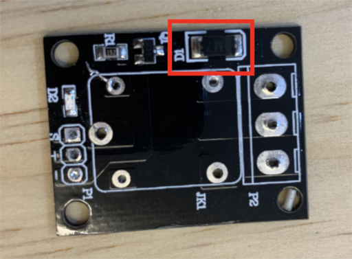 이제 PIN을 LOW로 놓고 잘 동작하는지 측정해 보았다. 전류는 거의 없는 것으로 나오는데 전압이 -2.4V가 나온다. 그래서 고장 난 릴레이 모듈을 살펴봤다. 다이오드가 보인다!