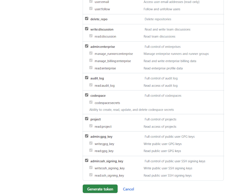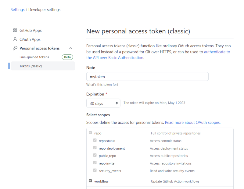 - 화면에서 토큰에 대한 간단한 기록, 만료기간, 권한 (Scopes)를 선택하고 생성한다.