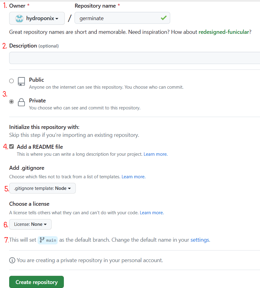 1. Owner에는 gihub을 만들 때 사용한 user id가 자동으로 표시되고, 입력해야 하는 repository name은 이 사용자 계정에서는 꼭 하나만 존재하는 유일한 이름 어여야 한다.