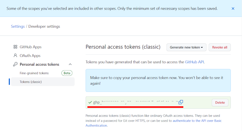 마지막에 있는 Generate token 버튼을 누르면, Token이 생성되고 화면에 표시된다. 이 토큰은 이 화면을 닫으면 더 이상 볼 수 없기 때문에 반드시 안전한 곳에 저장해야 한다. 이후에 token을 잃어 버리면 다시 생성 (Regenerate) 해야 한다.이제 git push와 같이 GitHub서버와 연동된 명령을 사용할 때 이 token을 비밀번호 대신 복사해서 넣으면 된다.