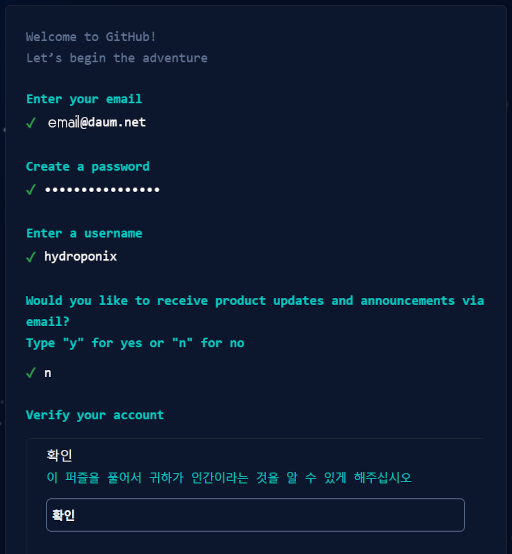 GitHub으로 가서 오른쪽 위에 있는 Sign Up버튼을 누르면 게정 생성을 할 수 있다. 요청하는 정보를 차례로 입력하고 마지막에 계정을 자동으로 생성하는 것을 방지하는 그림 퍼즐을 풀고 나면 GitHub 계정을 생성할 수 있다.