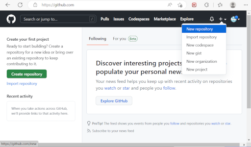 이제 내 노트북에서 GitHub에 저장할 수 있는 token을 만들었으니 새로운 프로젝트 공간 (Repository)를 만들어 보자.