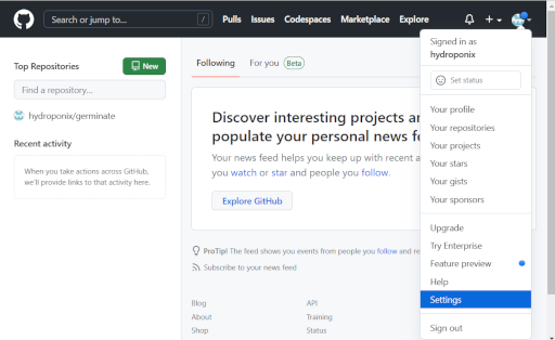 - 먼저 오른쪽 위 끝에 있는 Profile 아이콘을 누르고 그 아래 Settings을 선택한다.