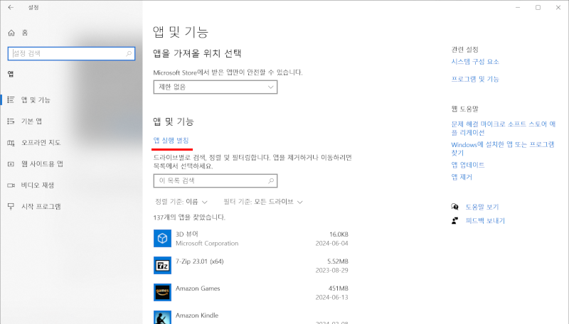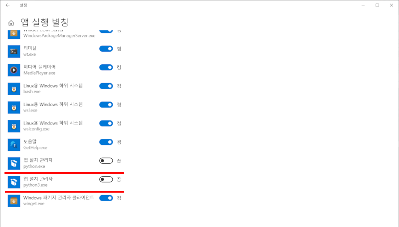 화면의 아래에 보면 보이는 "앱 설치 관리자" python.exe와 아래 python3.exe를 끄면 python을 입력했을 때 이제 더 이상 Microsoft Store로 이동하지 않는다.