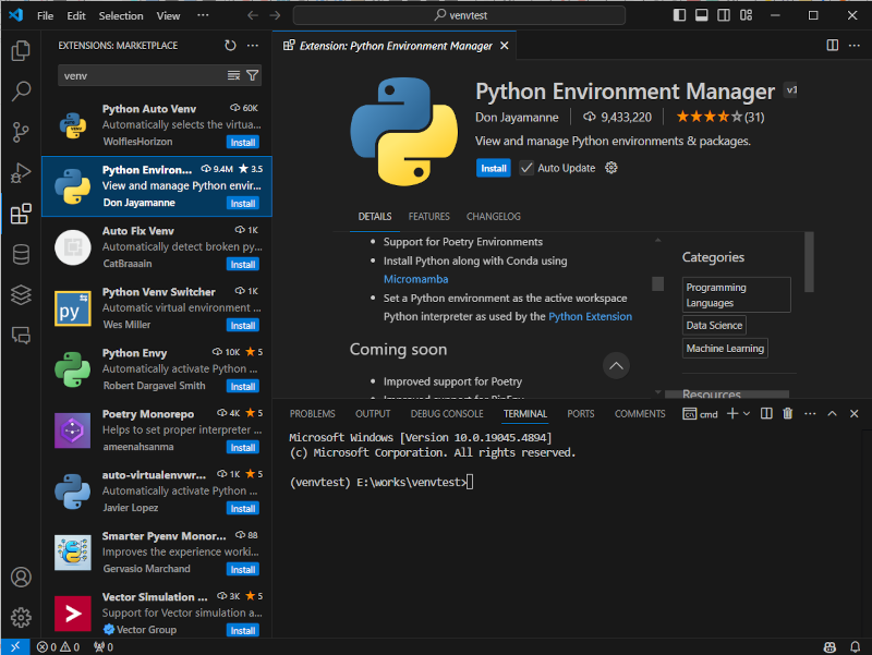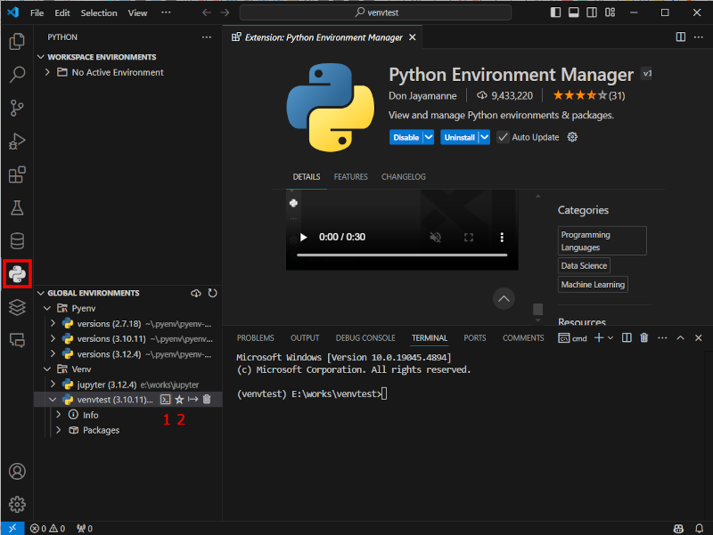 VSCode 사용 중에 좀 더 편리하게 가상환경을 바꾸고 싶다면, "Python Environment Manager" Extension을 설치하면 왼쪽 아이콘 목록에 파이썬 아이콘이 보인다.