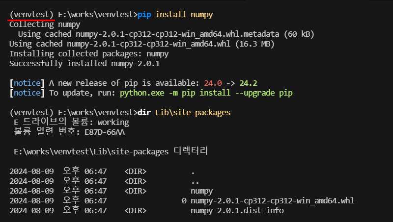 활성화된 상태에서 pip으로 numpy 패키지를 설치하면 Lib\site-packages폴더에 설치되는 것을 확인할 수 있다.
