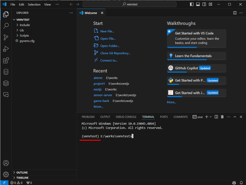 venv로 생성한 폴더로 이동한 다음 activate시키고 VSCode를 code명령으로 실행하면 VSCode에서 열리는 프로젝트에서 터미널로 확인해 보면 activation 된 가상환경 이름이 보인다.