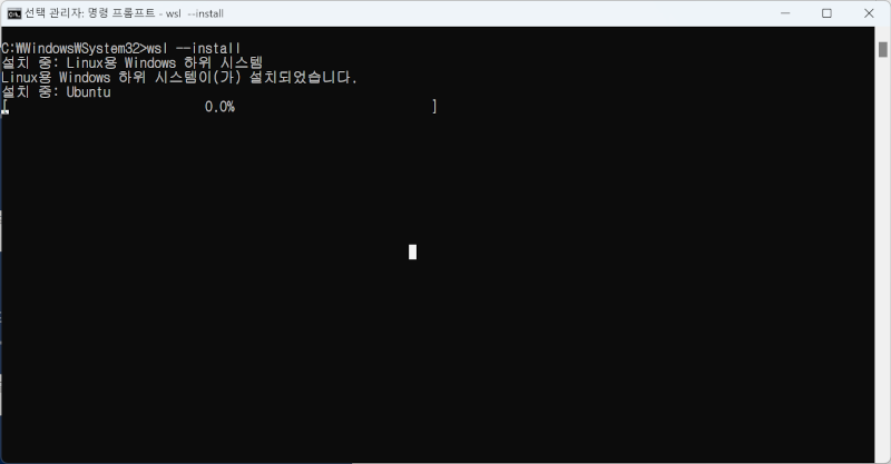 다시 별 생각없이 cmd.exe를 "관리자 권한으로 실행"했는데, 무슨 일인지 우분투 설치 부분에서 감감 무소식이다.