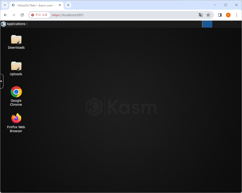 vnc사용 이름과 비밀번호를 묻는데, 암호는 docker를 생성할 때 -e VNC_PW로 지정한 암호를 사용하고 사용자 이름은 kasm_user를 입력하면