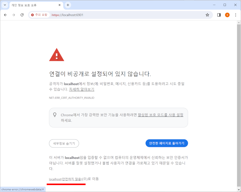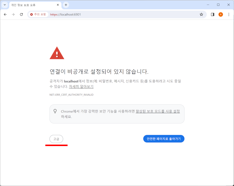 community 버전이다 보니 https로 접속할 때 인증서가 없어 다음과 같은 경고가 나타나는데, 여기서 고급을 선택하고,
