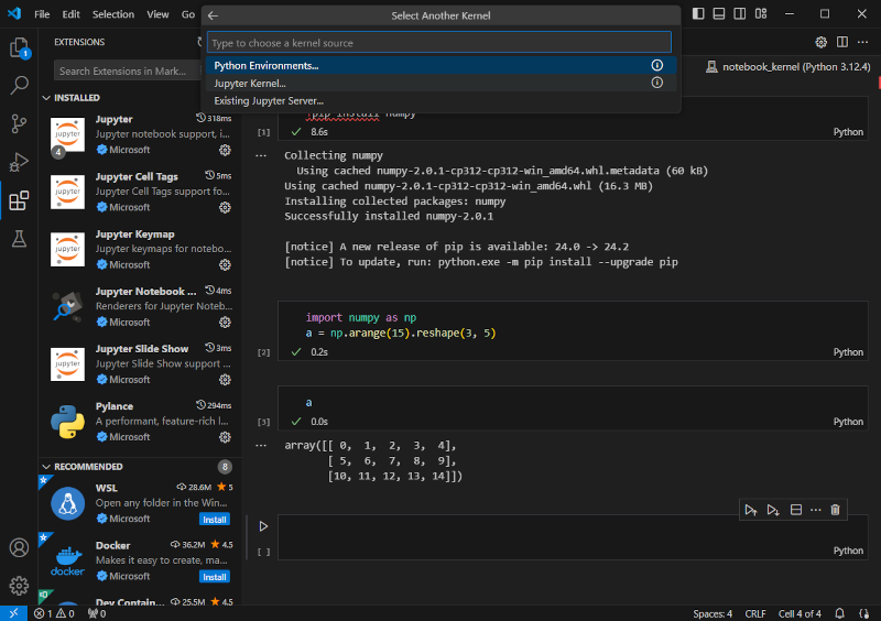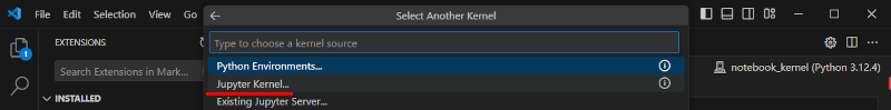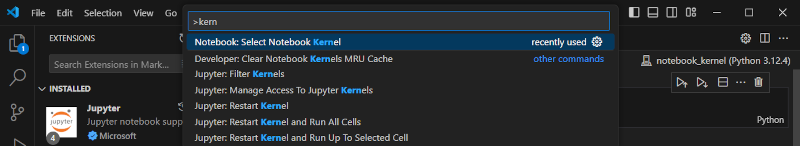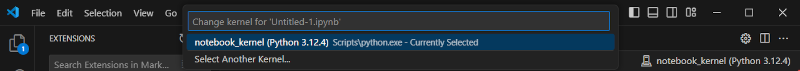 Ctrl+Shift+P로 Command Palette를 열고, "Notebook: Select Notebook Kernel"을 검색해서 선택하고,