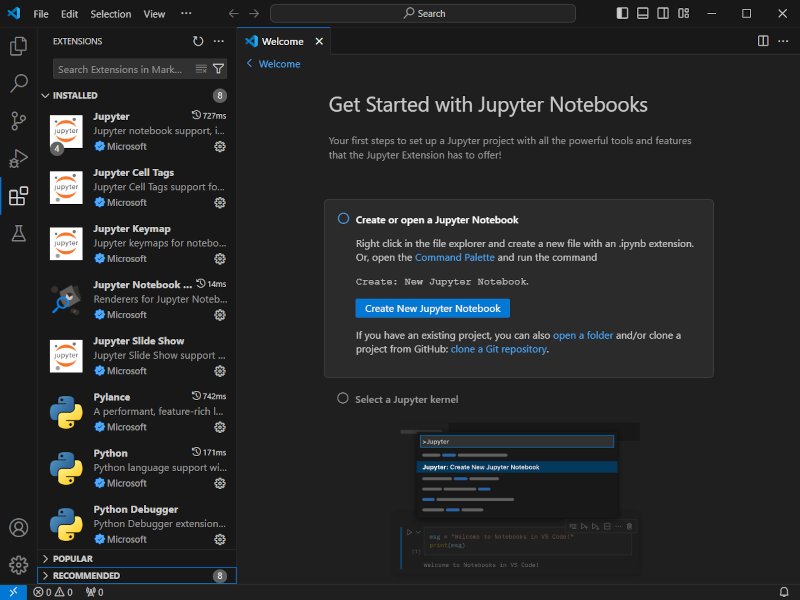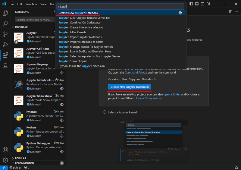 VSCode의 welcome화면에 있는 "Create New Jupyter Notebook"버튼을 이용하거나, Ctrl+Shift+P로 Command Palette를 열고 "Create: New Jupyter Notebook"을 검색한 후 notebook파일을 하나 만든다.
