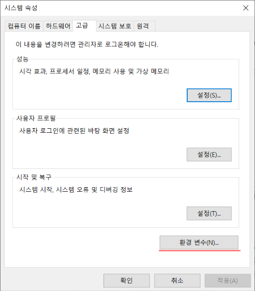 시스템 속성화면이 나오는데 여기서 "환경 변수(N)"를 클릭하면