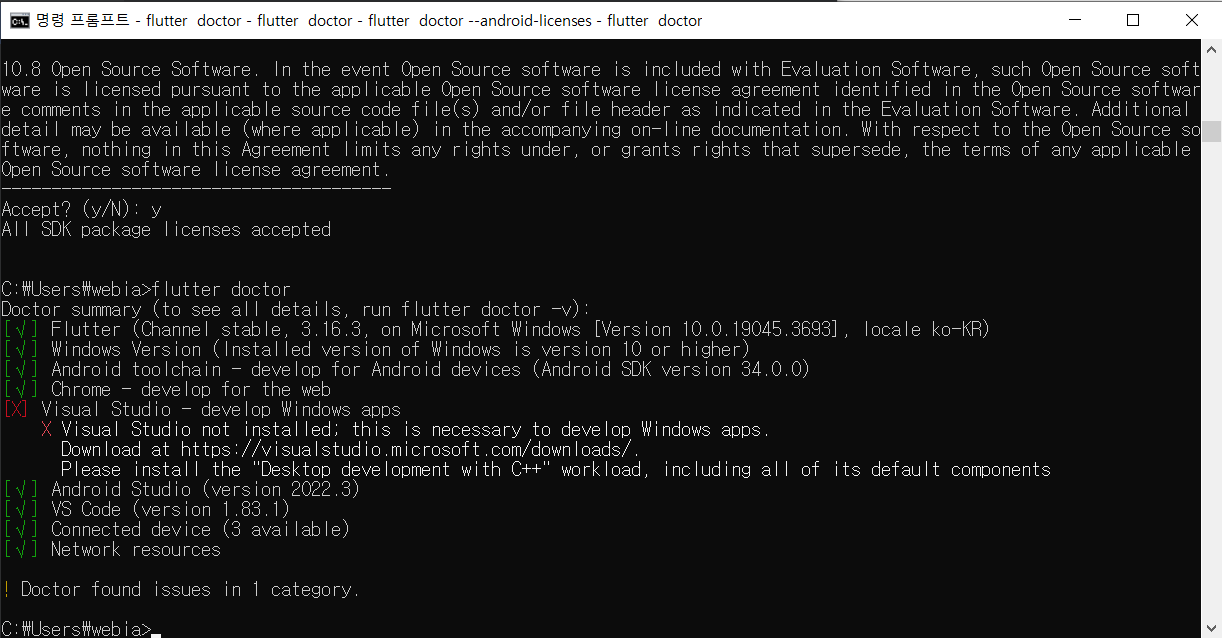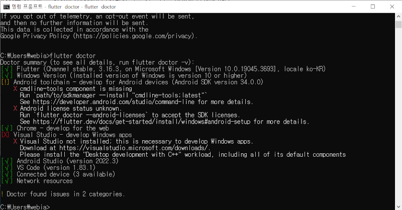 - 다시 flutter doctor를 실행해 보면 "cmdline-tools:latest"가 설치되지 않았고 license를 수락하지 않은 것으로 나온다.