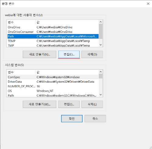 환경 변수를 설정할 수 있는 화면이 나온다. 여기에서 사용자 변수를 선택하고 편집을 누르면