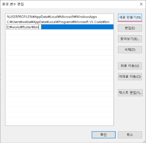 환경 변수 편집 화면이 나오는데, "새로 만들기(N)"를 선택하고 flutter sdk를 설치한 위치의 bin폴더의 위치를 입력하고 확인을 누른다.