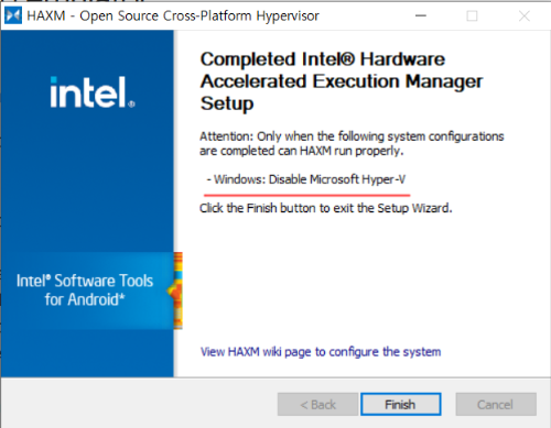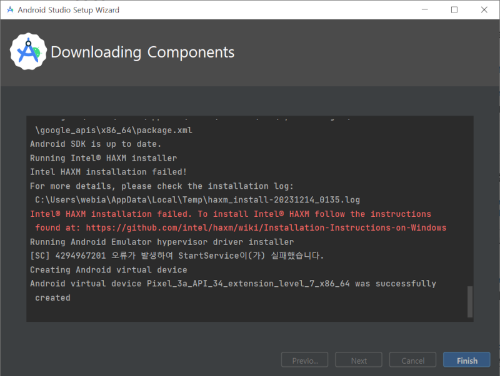 내가 설치했을 때에는 마지막에 아래와 같이 intel HAXM (Hardware Accelerated Execution Manager) 설치에 실패했다는 메시지가 나왔다.