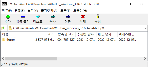 압축파일을 열어보면 flutter 폴더가 있는데 이것을 flutter sdk를 설치하려고 하는 위치에 풀어준다.