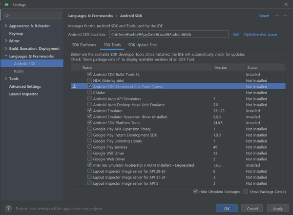 SDK Manager가 실행되면 "SDK Tools"를 열고 "Android SDK Command-line Tools (latest)"를 선택하고 Apply를 눌러 설치한다.
