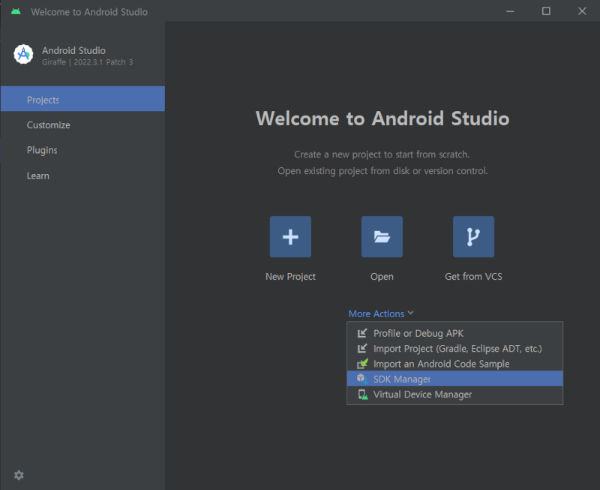 Android Studio를 열고 "More Actions"를 선택하면 SDK Manager를 실행할 수 있다.