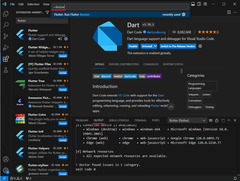 - 설치가 완료되면 Ctrl + Shift + P를 눌러 Command Palette를 열고 "flutter doctor"를 명령을 입력해 테스트해 본다.