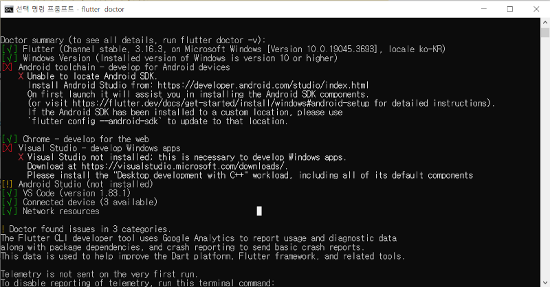 - flutter doctor를 실행해서 아직 완료되지 않은 설정을 확인한다.