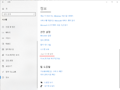 외쪽 아래에 있는 윈도우 아이콘을 누르면 선택할 수 있는 설정화면에서 "시스템/정보/고급 시스템 설정"을 클릭하면