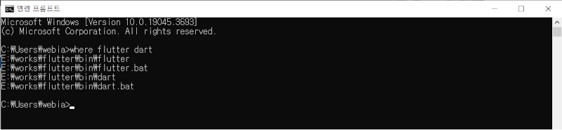 명령을 실행하면 flutter와 dart가 설치된 위치를 보여주는 것을 확인할 수 있다.