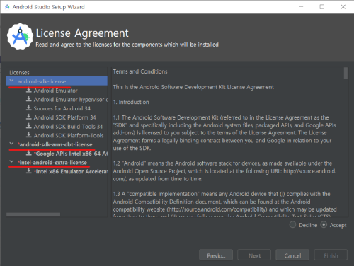 설치가 완료되고 Android Studio를 실행하면 최초 설정하는 화면이 나오는데 계속해서 Next를 클릭하면 License Agreement 화면이 나타난다. 여기서 왼쪽에 있는 각각의 License를 선택하고 Accept 바꾼 다음 Finish버튼을 누르면 Android SDK와 emulator의 설치가 시작된다.