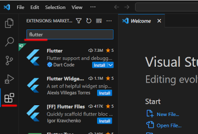 - VScode의 왼쪽에 나열되어 있는 아이콘 중 가장 아래에 있는 extensions를 선택하고 flutter를 검색한 후 설치한다.