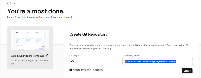 원하는 이름을 넣고 "Create"를 누르면 내 GitHub에 Admin Dashboard Template 프로그램 소스가 복사된다.