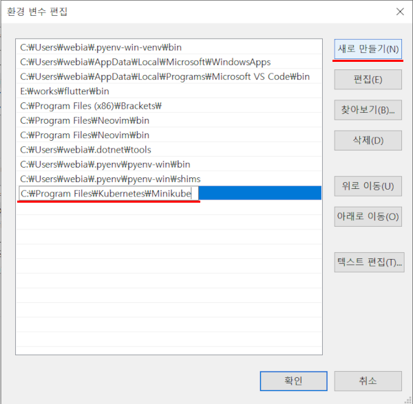 PowerShell에서 명령어로 설치하든, 설치프로그램을 사용해서 설치하든 설치가 완료되면 PATH 환경변수에 minikube의 위치를 추가해야 터미널에서 쉽게 작업할 수 있다.