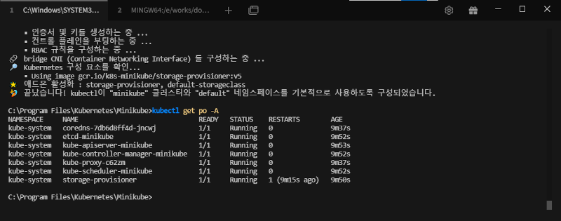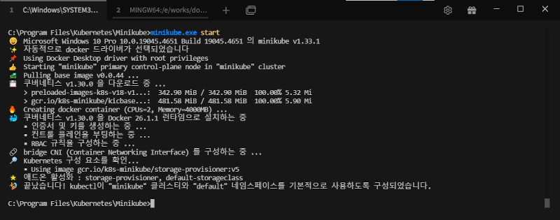 Docker desktop에서 설치한 쿠버네티스는 Docker와 함께 자동으로 실행되지만, minikube는 아래 명령으로 쿠버네티스 클러스터를 실행해야 한다.