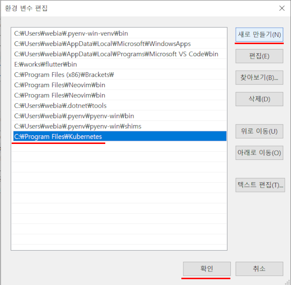 터미널에서 쉽게 실행하려면 kubectl의 위치를 환경변수 PATH에 추가해야 한다. PATH를 추가하기 위해서는, Win + R을 눌러 나오는 "실행"이 입력창에 "sysdm.cpl"을 넣고 실행해서 "시스템 속성" 관리화면을 띄운고, "고급"탭의 아래에 나오는 "환경변수"를 선택한 다음, "Path"를 "편집(E)"를 선택하고 kubectl의 위치(예; C:\Program Files\Kubernetes)를 추가한다.
