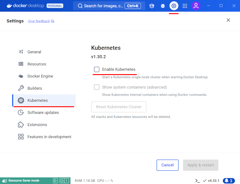 가장 쉽게 쿠버네티스 클러스터를 내 컴퓨터에 설치하는 방법은 Docker desktop이다. 상단 메뉴에서 Settings아이콘을 선택하면 나타나는 Settings화면의 왼쪽 메뉴에서 Kubernetes을 선택하면, 오른쪽 화면에 쿠버네티스를 설치할 수 있는 Enable Kubernetes체크박스 가 있다. 이 체크박스를 선택하면 쿠버네티스가 설치된다.